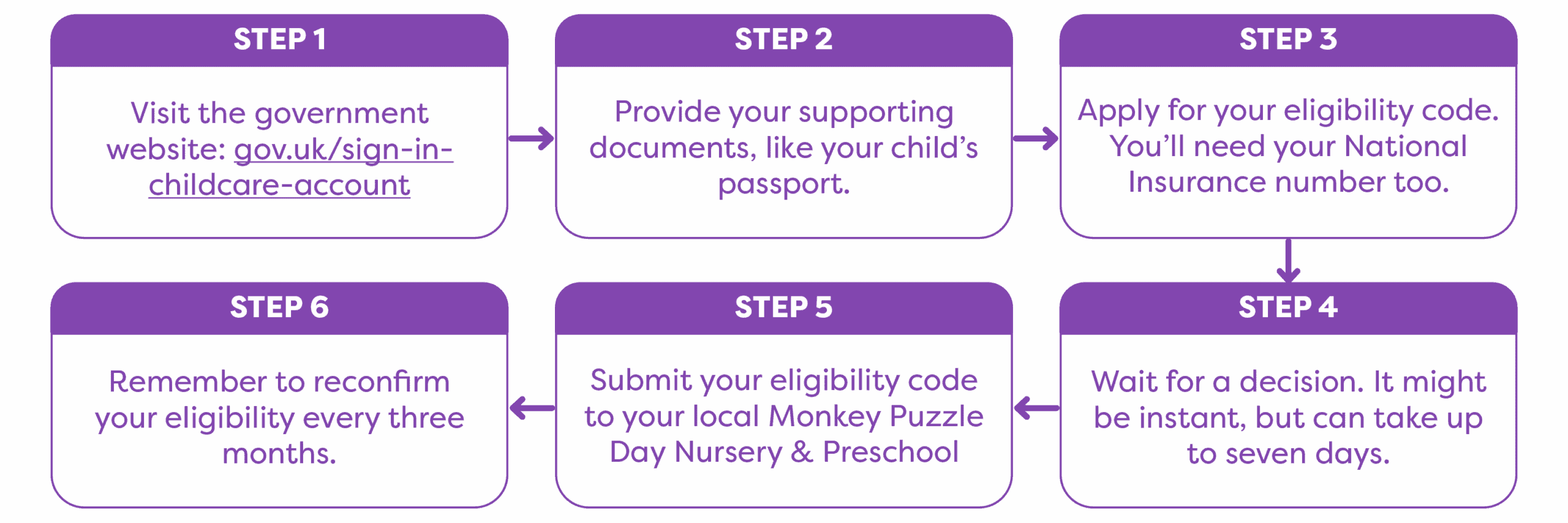 You will then need to provide your Monkey Puzzle Day Nursery with your 11-digit eligibility code, NI number and child’s DOB in order for them to be able to claim the Extended funding for your child.